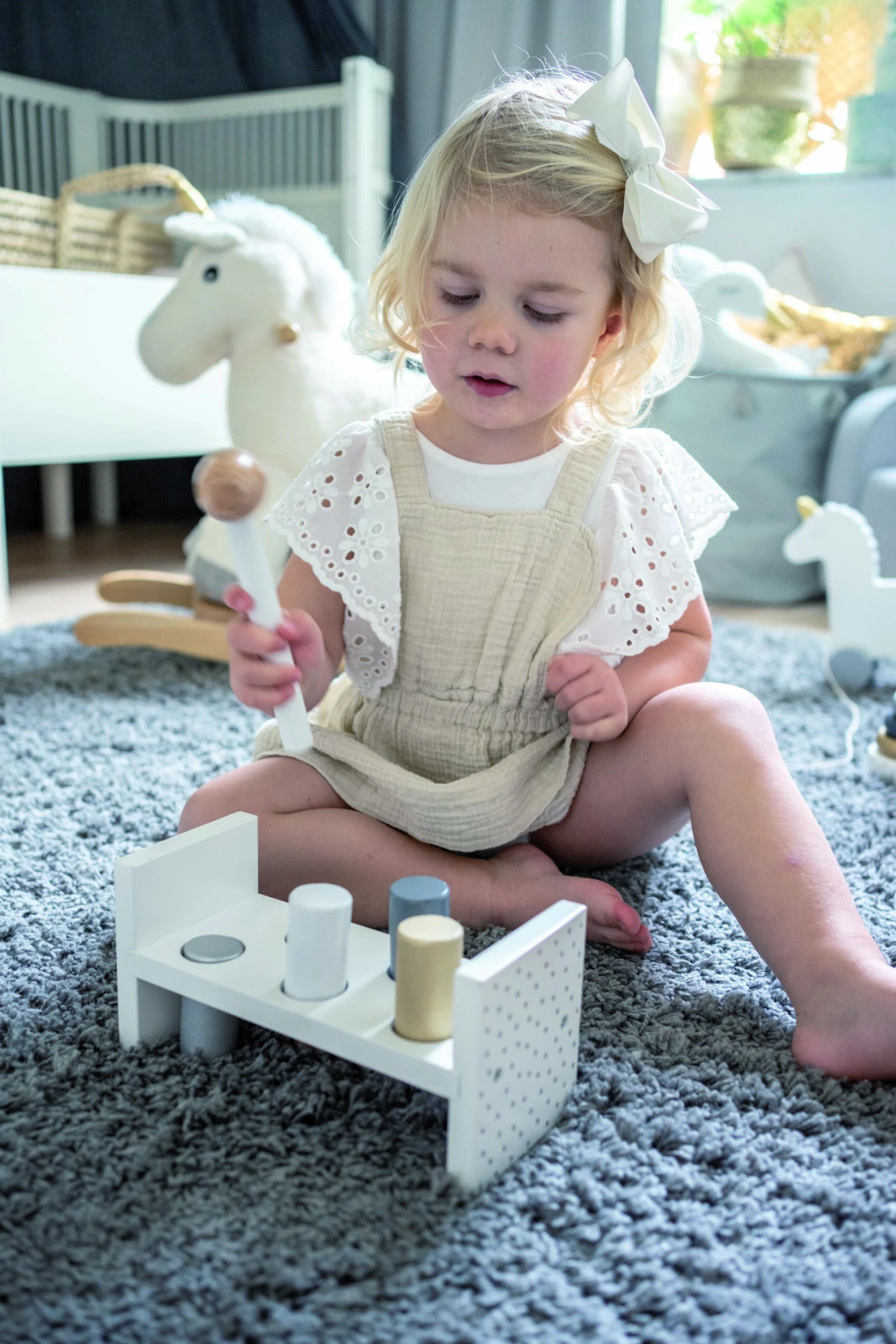 Ihr Kind wird diese Klopfbank lieben und fördert beim Spielen seine Koordination und Konzentration. Die Hammerbank besteht aus einem Hammer, fünf Holzklötzen in weiss, silber, gold, natur und schwarz, sowie einer Hammerbank.