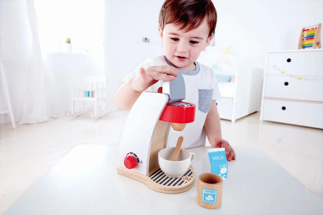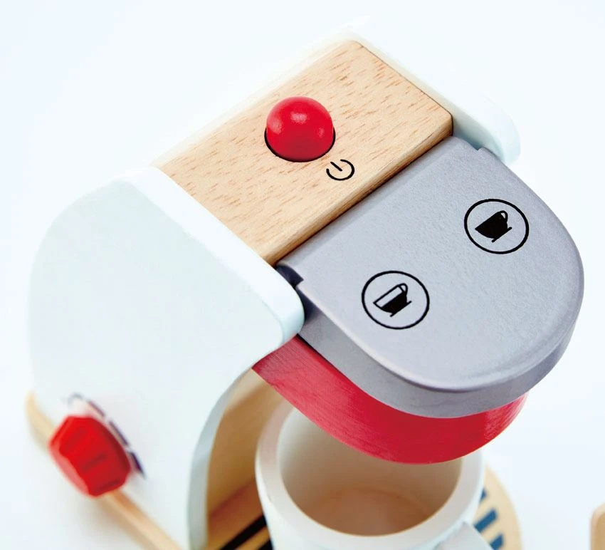 Mit dieser Kaffeemaschine können Kinder das zubereiten von Kaffee toll nachspielen. In dem Kompletten Kaffee-Maschinen-Set ist die Kaffeemaschine aus Holz, eine Tasse, eine Zuckerdose mit Löffel, eine Milchtüte und Kaffee-Pads zum Einlegen in die Kaffeemaschine enthalten. Die Tasse wird auf die Heizplatte der Kinder-Kaffee-Maschine gestellt, die Kaffeemaschine wird mit Kaffee-Pads befüllt und nach einem Druck auf den Einschalter kann die Tasse auch gleich wieder entnommen werden. Die sehr beliebte und äußerst robuste Kaffeemachine sollte in keiner Spielküche aus Holz fehlen.
