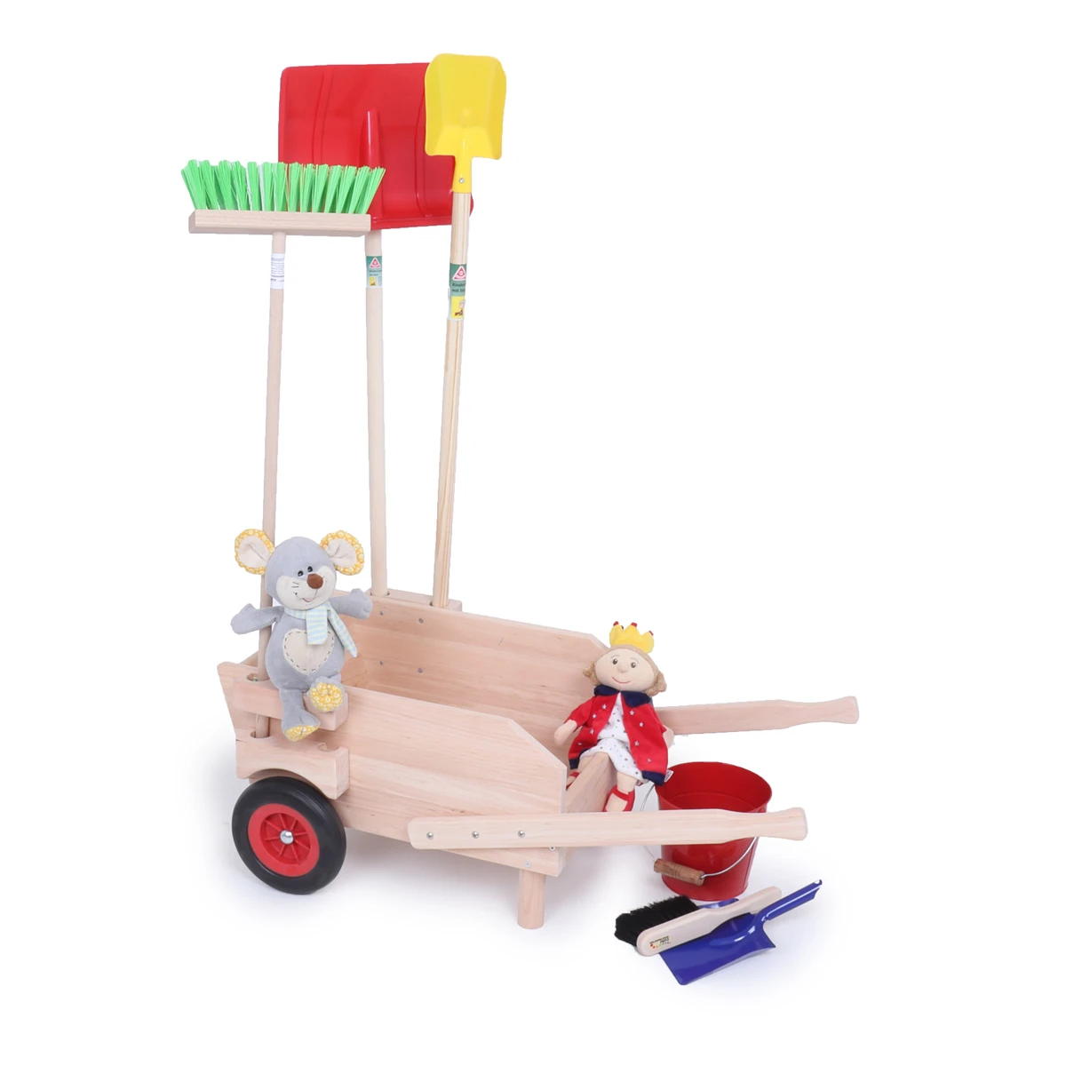 Mit unserer Kinder-Schubkarre aus Naturholz machst du deinen Kids richtig Freude. Ideal für kleine Nachwuchs-Gärtner oder Bauarbeiter, zum Arbeiten im Blumenbeet oder beim Helfen im Garten. Für Straßenfeger, Müllsammler, Schneemänner oder Weihnachtsmänner ein Spielgerät für das ganze Jahr. Alles beisammen – Besen, Schaufel, Harke und für den Winter den Schneeschieber. Alle diese Teile kannst du wunderbar zu der Kinder-Schubkarre hinzubestellen, denn für alle diese Teile hat die Kinder-Schubkarre eine extra Halterung. Gartengeräte einstecken und schon geht’s los.