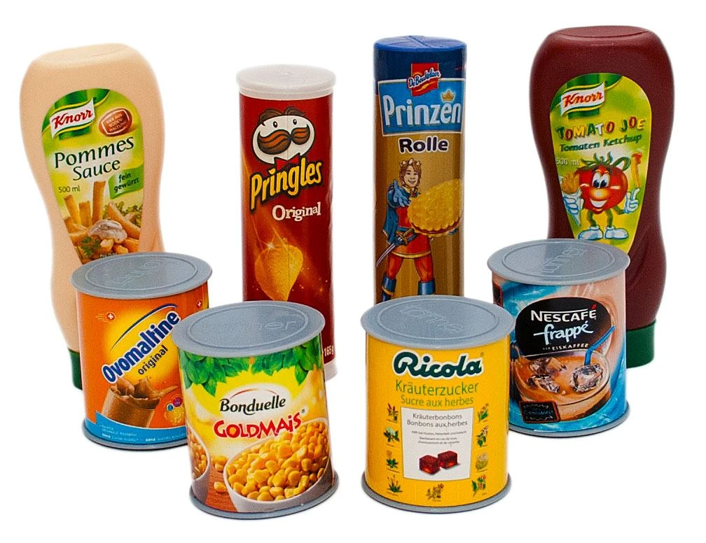 Dieses 8-teilige Dosenset hat echte Markenaufdrucke. Dieses Set besteht aus Ketchupflasche, Mayonnaiseflasche, Gemüsedosen, Bonbondose, Nussedose, und mehr. Dieses Sortiment ist eine optimale Bereicherung im Verkaussortiment des Kinderkaufladens. Zudem darf das Spielzeug-Lebensmittelset in keiner Kinderküche fehlen.