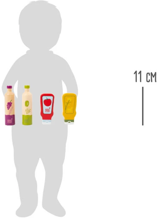 Mit diesem Spielset ist der Wocheneinkauf schnell erledigt! Bestehend aus einer Flasche Senf, Ketchup, Öl und Essig ist dieses 4-teilige Set eine schöne Ergänzung für Kinderkaufmannsladen oder Kinderküche.