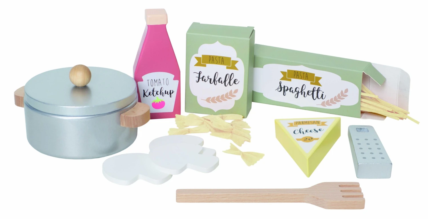 Das Pasta-Set ist kindgerecht und hübsch aus Holz gefertigt. Zum Set gehören: ein Topf zum kochen der Nudeln, ein Spaghettilöffel, eine Packung Spaghetti, eine Packung Farfalle, eine Käse-Reibe, ein Stück Parmesan, eine Flasche Ketchup und 3 Pilze. Wie bei Mama und Papa oder in der Pizzeria!