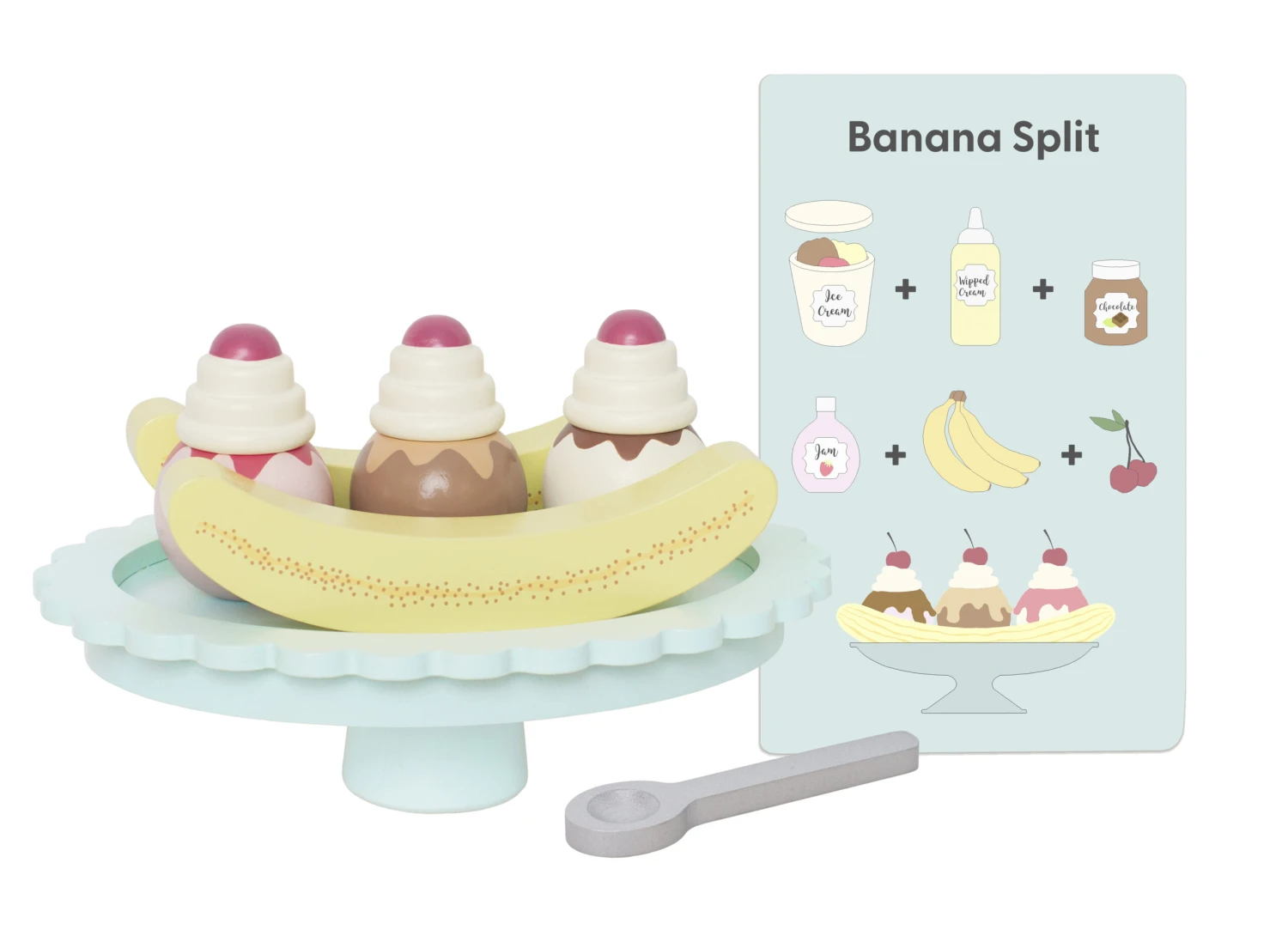 - Lieferumfang: 1 Servierplatte, 1 Löffel, 2 Bananen, 3 Kugeln Eis, 3 Sahne-Toppings, 1 Rezept