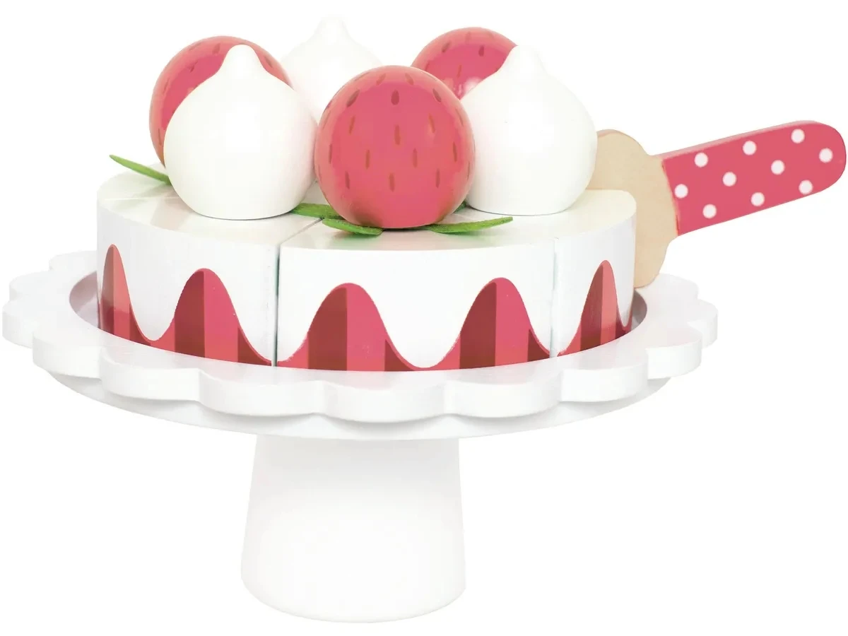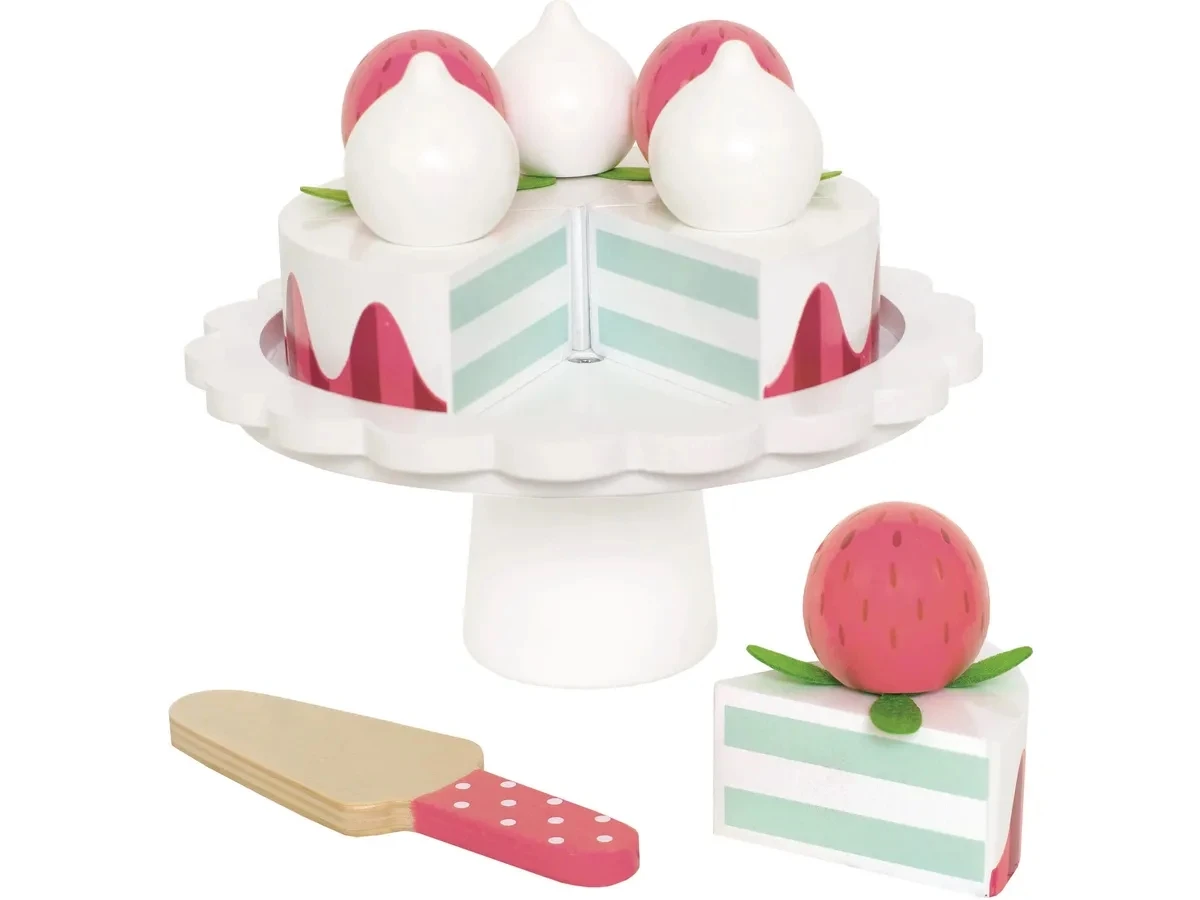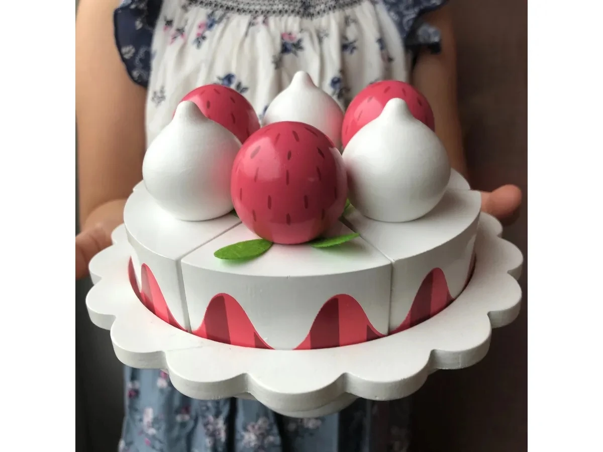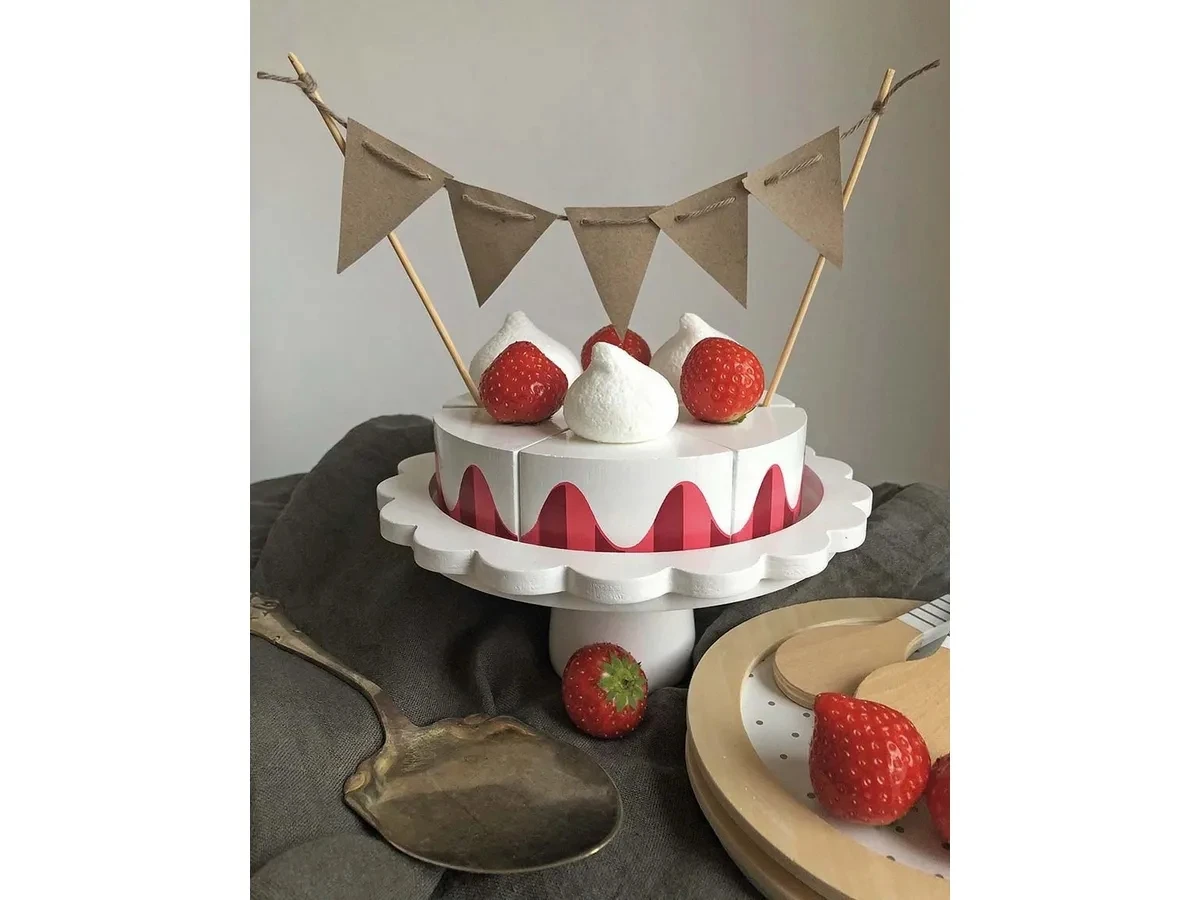 Unser Kinder-Erdbeer-Kuchen aus Holz hat 6 Stücke, die auf dem Tortenteller Platz finden. Schön dekoriert mit weißen und roten aufgesteckten Erdbeeren ist die Geburtstagstorte ein Hingucker auf jedem Kindergeburtstagstisch. Ein aus Holz gefertigter Tortenheber hilft die geschnittenen Tortenstücke auf den Teller zu bringen. Wie werden sich die Kindergeburtstags-Gäste freuen, wenn sie so einen leckeren Erdbeerkuchen serviert bekommen. Oder steht der Erdbeerkuchen in einer Bäckerei neben weiteren Leckereien? Dann kann dein Kind sich im Rollenspiel im Verkaufen üben.