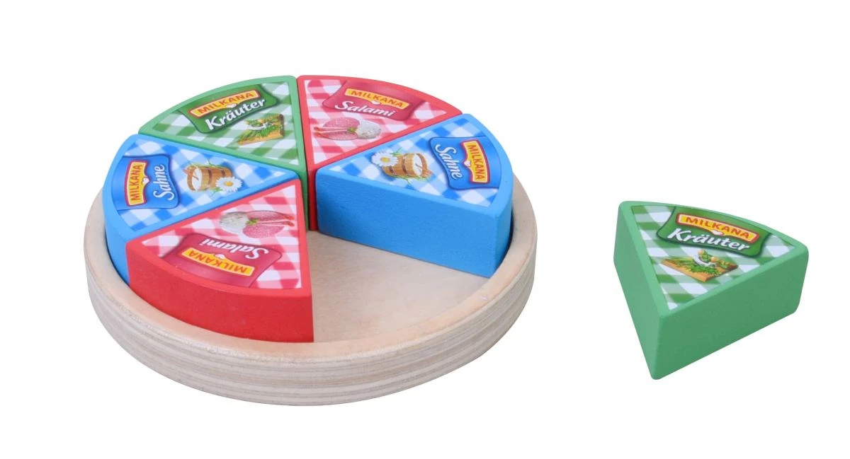 Echte Milkana-Käseecken – natürlich aus Holz! Salami, Kräuter und Sahne, diese Sorten werden, wie auch in der echten Verpackung im Kühlregal vom Supermarkt, präsentiert auf einem schicken Holztablett! Das 6-teilige Milkana-Käseecken-Set ist aus Holz gefertigt und hat den Aufdruck der echten Milkana-Käseecken. Damit macht das Klaufladen-Spielen doppelt Spaß!
