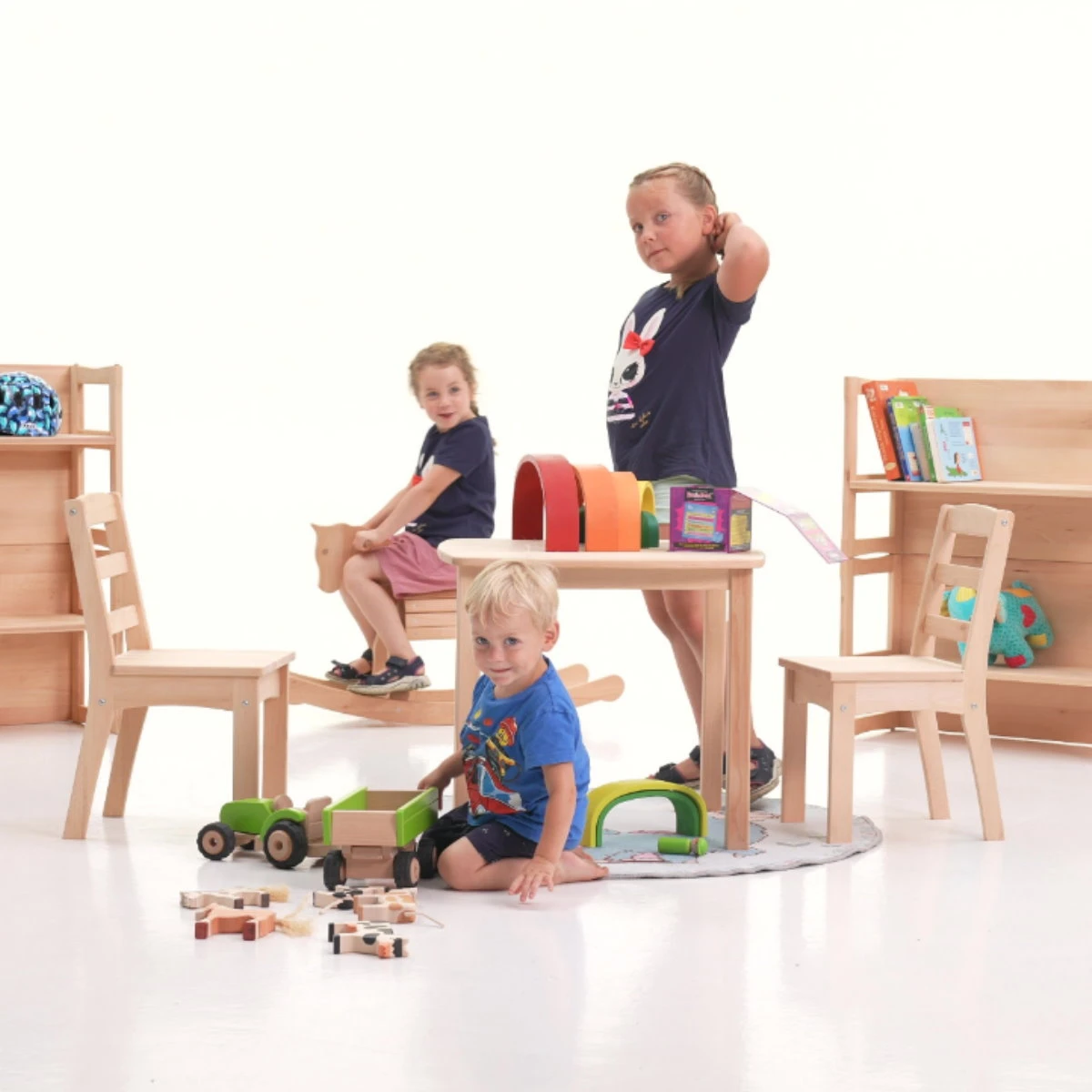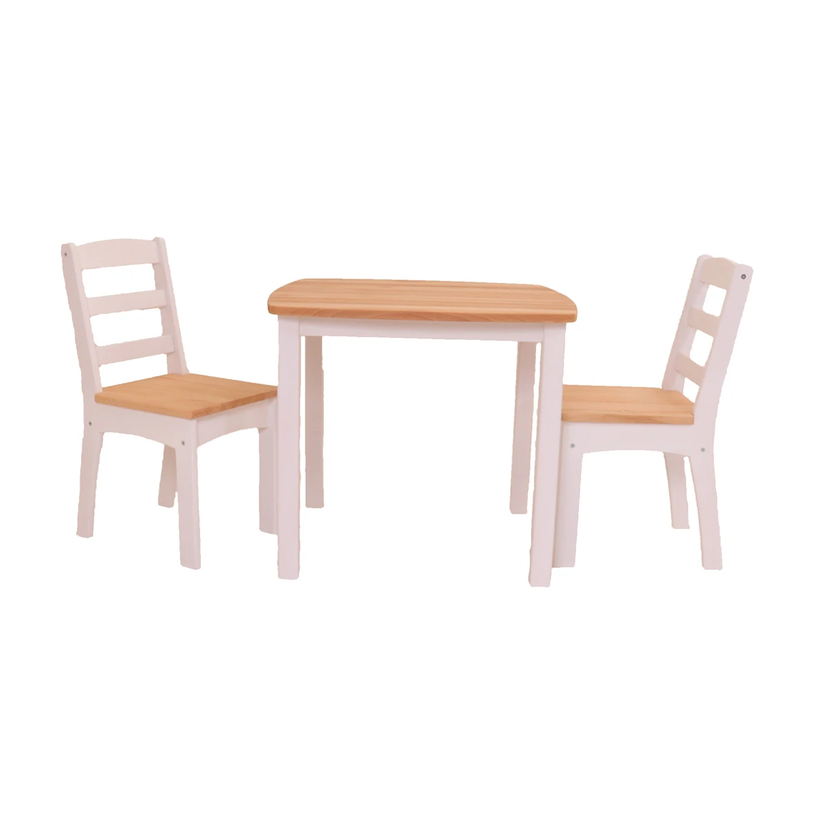 Das massive Holz ist strapazierfähig und stabil verarbeitet. Die Kinder-Holz-Tisch-Platte ist an den Ecken abgerundet. Die Kinder-Holz-Stuhl-Sitzflächen sind ebenfalls leicht abgerundet. Die auswählbare Tischbeinerhöhung in Holzoptik oder in Weiß lässt sich ganz einfach unter die Tischbeine einstecken. Ein nachträglicher Unterbau ist nicht möglich. Da Holz ein Naturprodukt ist, kann es zu farblichen Unterschieden in der Natur-Holz-Oberfläche von Kinder-Holz-Tisch und Kinder-Holz-Stuhl kommen.