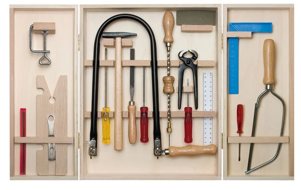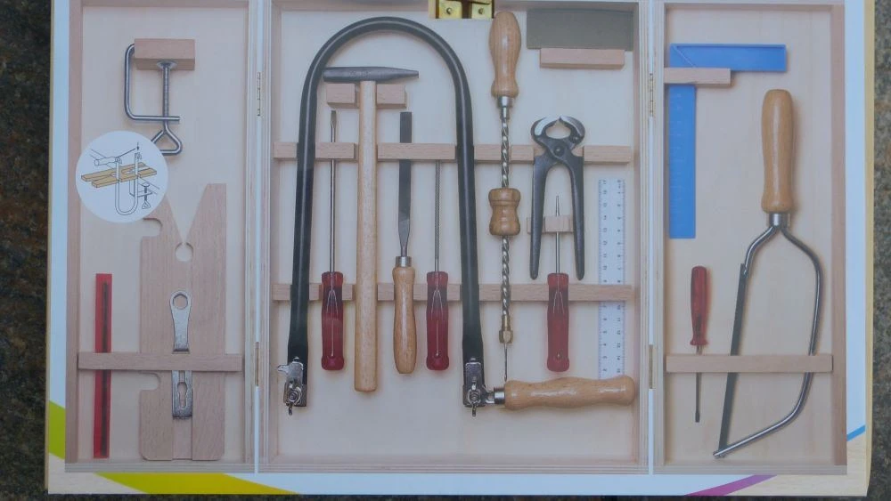 Laubsäge-Set im Holzschrank mit Holzbrettchen und Stahlwerkzeugen